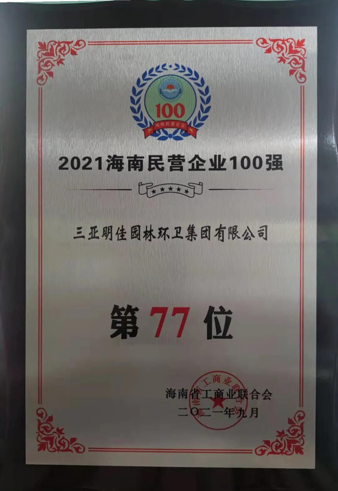 11月4日,海南省工商業(yè)聯(lián)合會(huì)在??诎l(fā)布“2021海南民營(yíng)企業(yè)100強(qiáng)”榜單。三亞明佳園林環(huán)衛(wèi)集團(tuán)有限公司2019至2021年連續(xù)三年入選海南民營(yíng)企業(yè)100強(qiáng)。